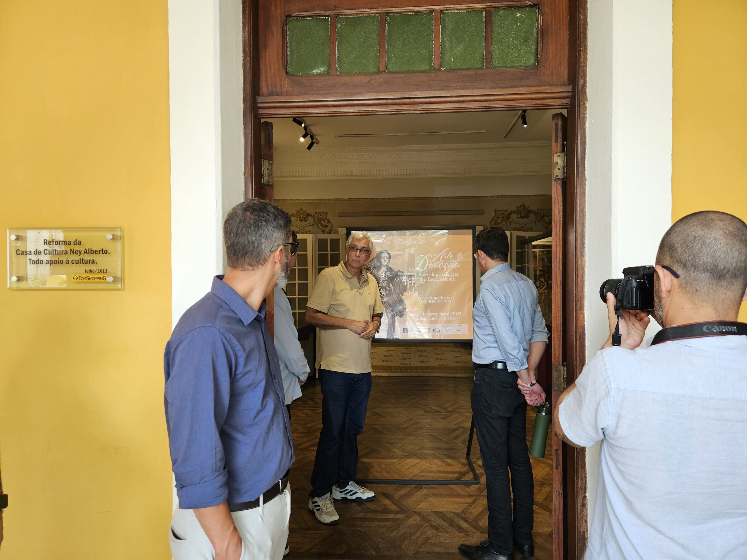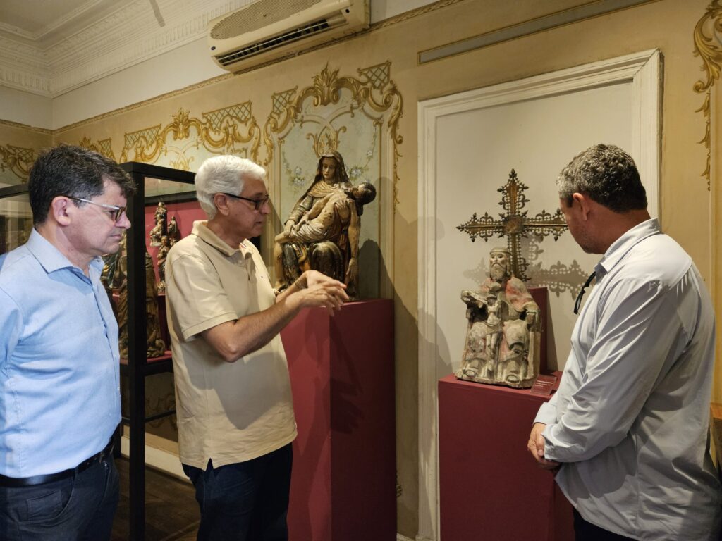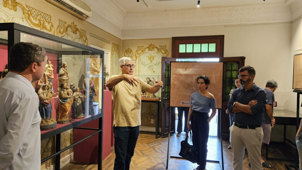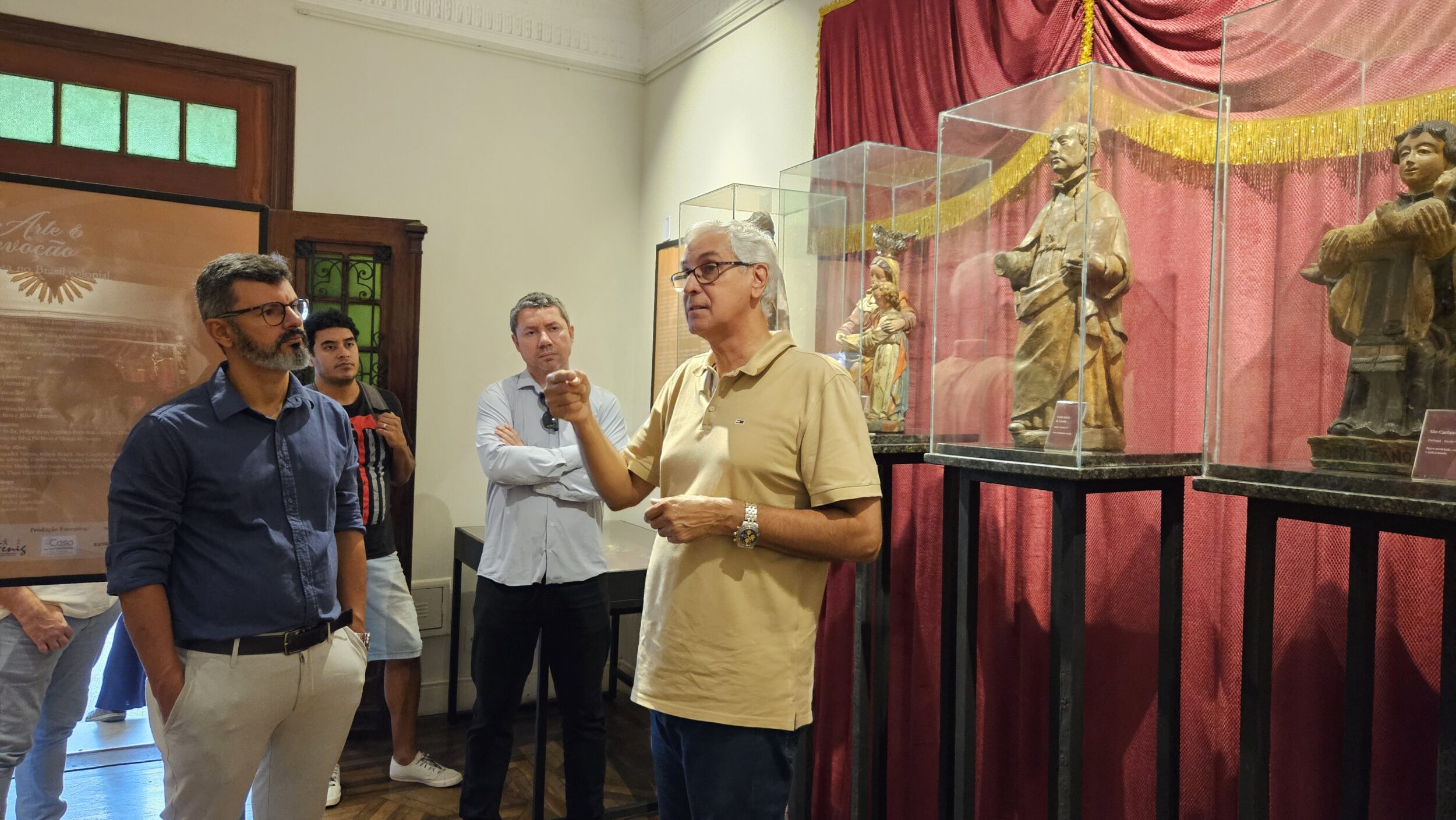 Durante a visita, Marcus Monteiro contextualizou as obras, detalhando suas origens, técnicas e trajetórias históricas. A apresentação assumiu caráter didático, aproximando a experiência de uma verdadeira aula sobre arte sacra e patrimônio cultural brasileiro.